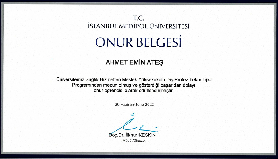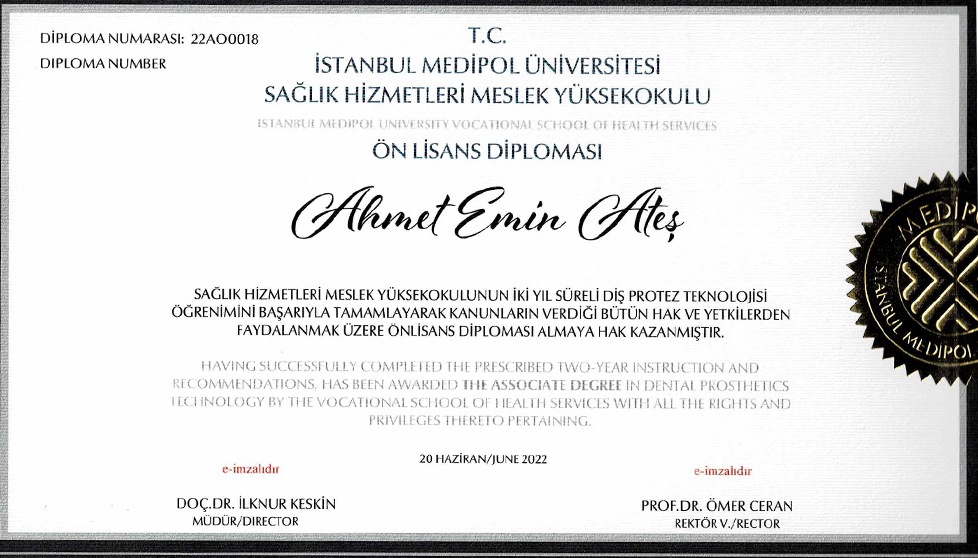 CDT Ahmet Emin Ateş, 2002 yılında İstanbul’da doğmuş olup, 2020 yılında Anadolu Lisesi’nden mezun olduktan sonra İstanbul Medipol Üniversitesi Diş Protez Teknolojisi bölümüne yerleşmiştir. 2022 yılında bölümünü üstün başarıyla tamamlayarak meslek hayatına güçlü bir başlangıç yapmıştır.